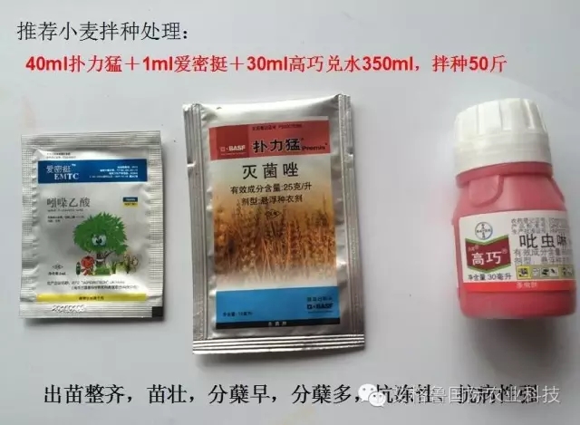 处理三:40ml扑力猛+20ml艾格富+30ml高巧兑水350ml,一次拌种50斤,共计100斤,示范5亩。